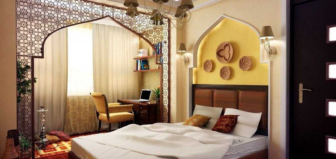 Арабский стиль – это роскошь‚ изысканность и великолепие. В интерьере используются дорогие материалы‚ такие как шелк‚ бархат и золото. Мебель украшена резьбой и инкрустацией. Основные элементы арабской спальни: